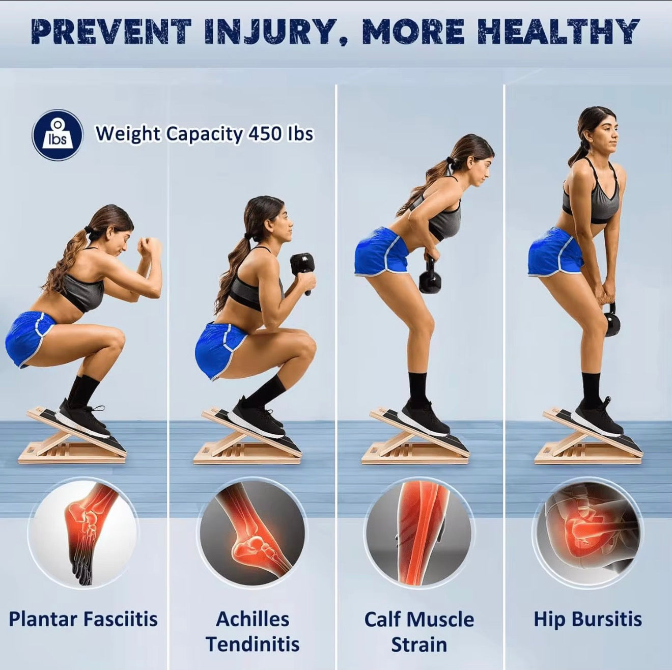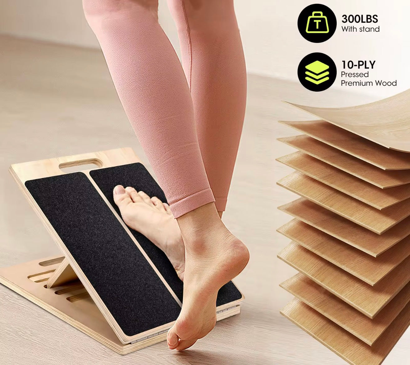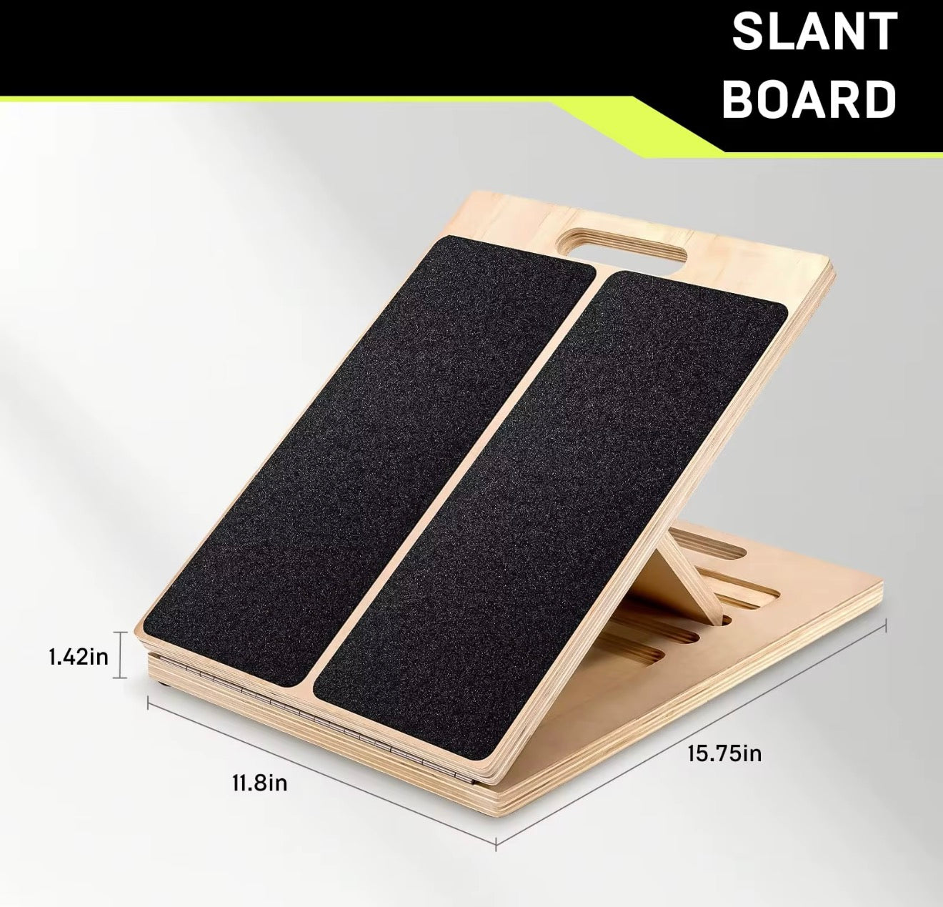 En justerbar lutningsbräda (så kallad slantboard) som hjälper dig både med stretching och styrketräning. Konstruktionen är av trä. Och håller för ca 200 kg.